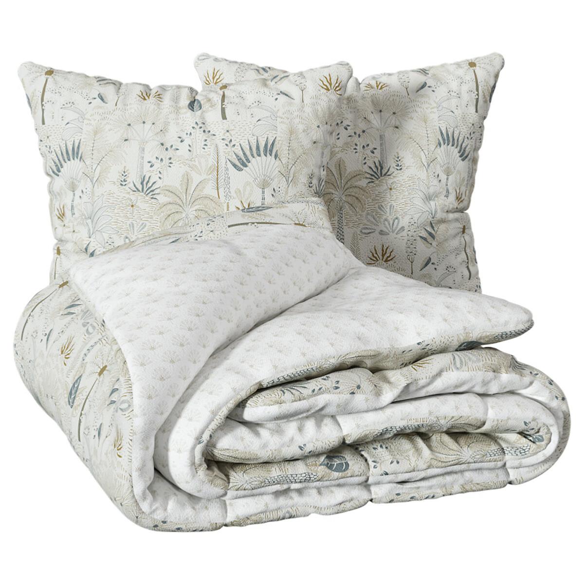 Le verso, plus discret, présente un motif délicatement répétitif dans des tons clairs, idéal pour varier l’ambiance selon vos envies. Les taies assorties reprennent le motif végétal pour un ensemble parfaitement coordonné.